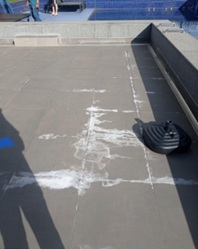 Descolamento e Rupturas nos Rodapés: A falta de previsão de embutimento e estruturação correta nos rodapés, somada à ausência de juntas perimetrais de dessolidarização, faz com que a movimentação natural da estrutura rasgue a impermeabilização nas quinas, causando o descolamento da manta e infiltrações severas pelas paredes.